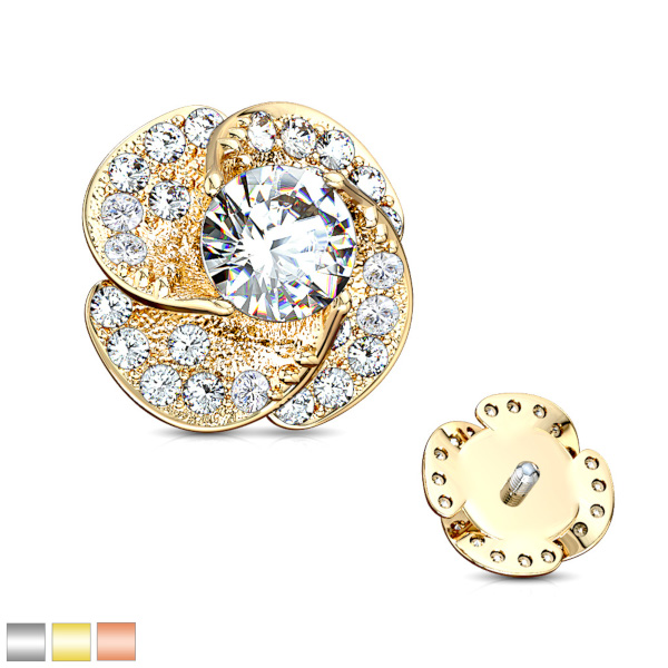 Накрутка из хирургической стали 316L с латунным цветком диаметром 8 мм, украшенным кристаллами. Подходит для украшений толщиной 1,6мм с внутренней резьбой и микродермалов.