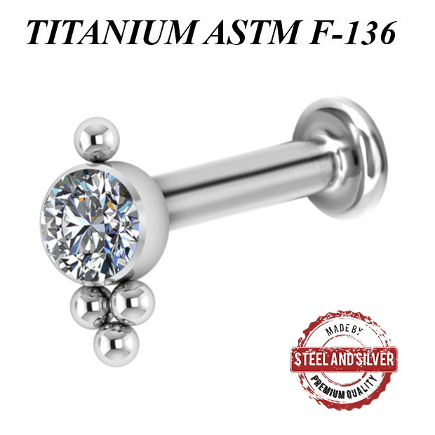 Лабрет из имплантационного титана 6Al-4V-Eli ASTM: F-136 с внутренней резьбой. Украшен Premium Crystals 4мм.
