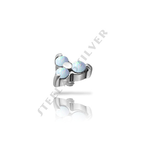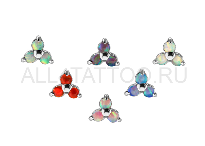 Накрутка из 316L стали в форме трилистника, украшенного синтетическими опалами. Резьба накруток 0,8мм подходят к украшениям толщиной 1 и 1,2мм с внутренней резьбой. Диаметр накрутки 4мм.