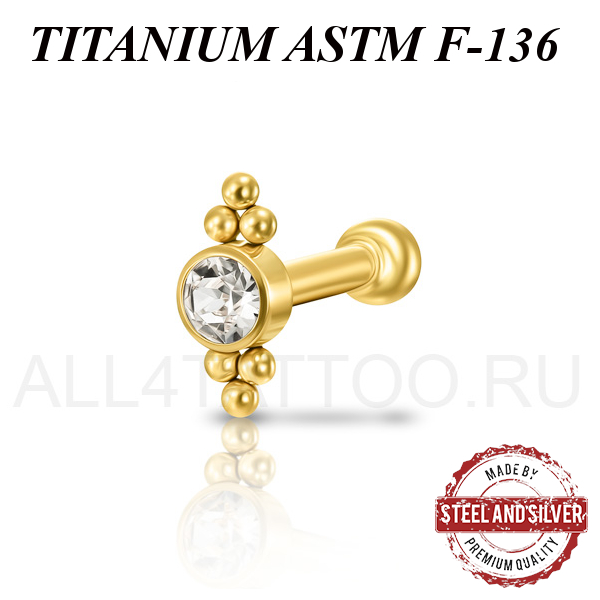 Микроштанга из имплантационного титана 6Al-4V-Eli ASTM: F-136 с 24х каратным золотым PVD покрытием, внутренняя резьба. Украшена кристаллом Swarovski диаметром 3 и 4мм.