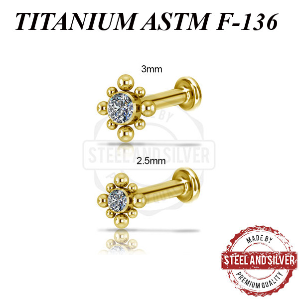 Лабрет из имплантационного титана 6Al-4V-Eli ASTM: F-136 с внутренней резьбой и  PVD покрытием 24х каратного золота. Накрутка украшена  Premium Crystals диаметром 3мм.