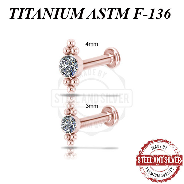 Лабрет с внутренней резьбой из имплантационного титана 6Al-4V-Eli ASTM: F-136 с PVD покрытием розового золота. Украшен кластером с Premium Crystals.