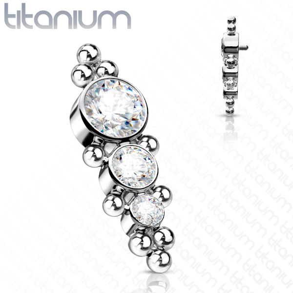 Кластер из имплантационного титана 6Al-4V-Eli ASTM: F-136 украшен стразами 4, 3 и 2мм. Резьба 0,9мм подходит для украшений толщиной 1 и 1,2мм с внутренней резьбой, резьба 1,2мм подходит для украшений толщиной 1,6мм с внутренней резьбой.