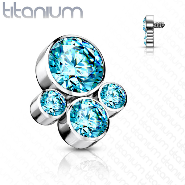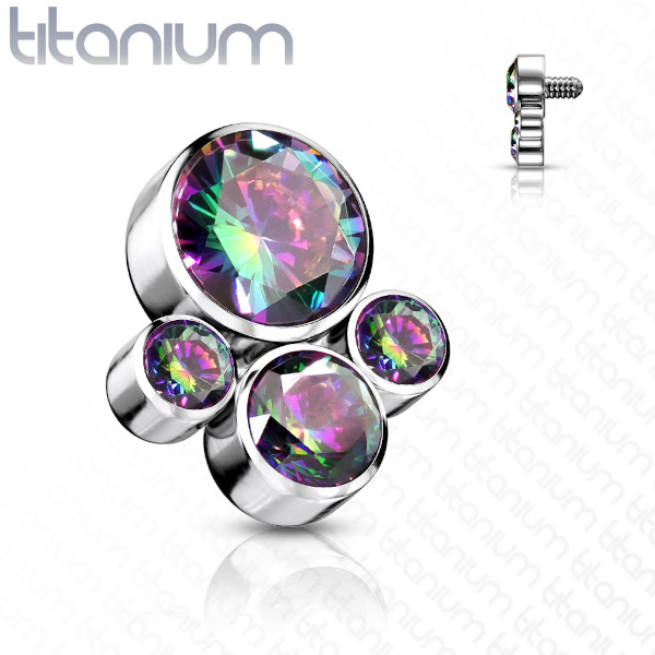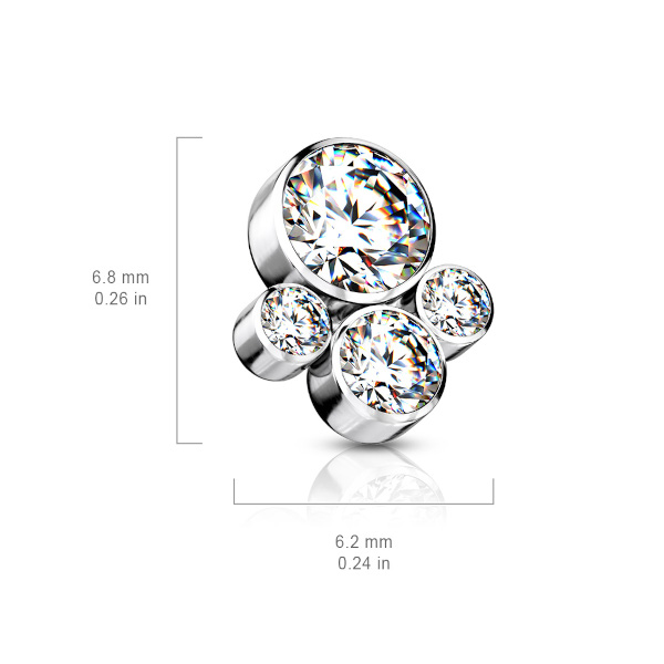 Кластер из имплантационного титана 6Al-4V-Eli ASTM: F-136 украшен стразами. Резьба 0,9мм подходит для украшений толщиной 1 и 1,2мм с внутренней резьбой, резьба 1,2мм подходит для украшений толщиной 1,6мм с внутренней резьбой.