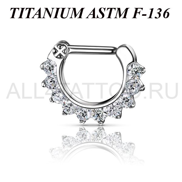 Кликер для септума из имплантационного титана 6Al-4V-Eli ASTM: F-136, с декоративной частью украшенной сетом прозрачных фианитов.
