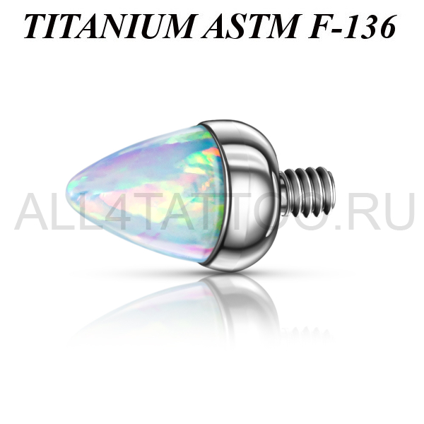 Накрутка из имплантационного титана 6Al-4V-Eli ASTM: F-136. Украшена конусом из лабораторного опала. Подходит для украшений с внутренней резьбой толщиной 1,6мм.