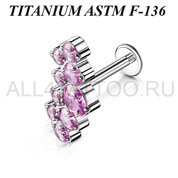 Лабрет из имплантационного титана 6Al-4V-Eli ASTM: F-136 с внутренней резьбой. Украшен кластером с цветными фианитами. Размер декоративной части: 15х7мм.