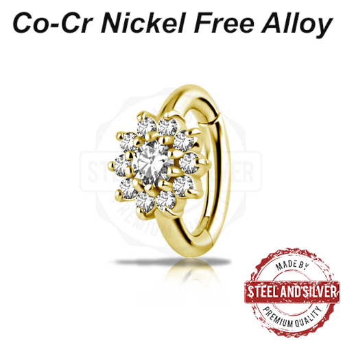 Кликер из сплава кобальт-хрома, без содержания никеля с 24х каратным золотым PVD покрытием. Декоративная часть в форме цветка украшена премиальными цирконами. Диаметр декоративной части: 7мм.