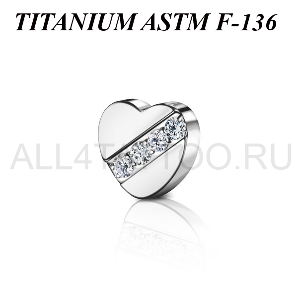 Накрутка из имплантационного титана 6Al-4V-Eli ASTM: F-136 в форме сердца с сетом прозрачных фианитов. Размер накрутки: 5х4,5мм. Подходит для украшений с внутренней резьбой толщиной 1 и 1,2 мм.