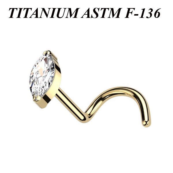 Нострил из имплантационного титана 6Al-4V-Eli ASTM: F-136 с золотым PVD покрытием. Украшен прозрачным фианитом огранки "маркиз"