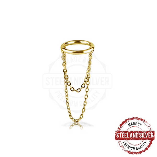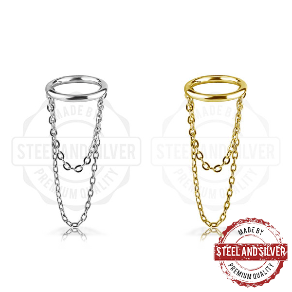 Кликер из хирургической стали 316L. Представлен в двух вариантах: классический стальной и с 24х каратным золотым PVD покрытием. Украшен двумя цепочками. Длина цепочек до места сгиба: 13мм и 22мм.