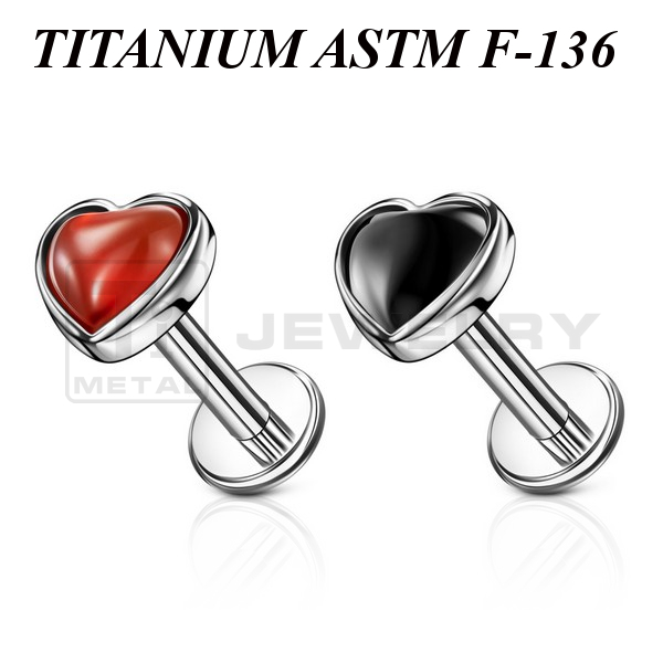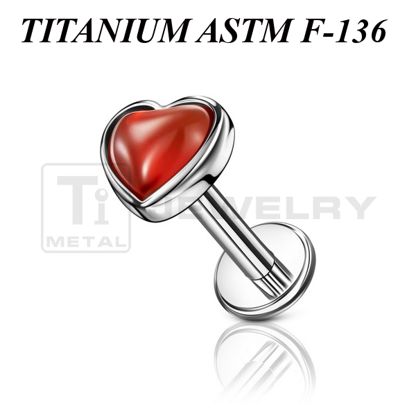 Лабрет из имплантационного титана 6Al-4V-Eli ASTM: F-136 с внутренней резьбой. Накрутка в форме сердца украшена минералами: