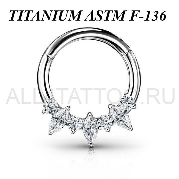 Кликер из имплантационного титана 6Al-4V-Eli ASTM: F-136. Предаствлен в двух вариантах: полностью прозрачные фианиты и чередующиеся синие с прозрачными фианиты.