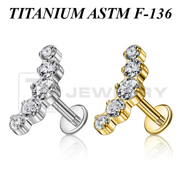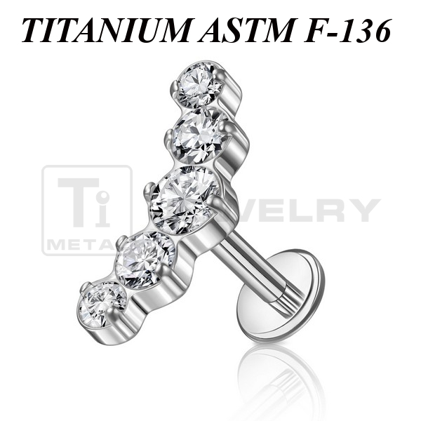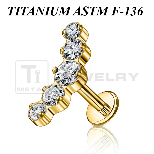 Лабрет с внутренней резьбой из имплантационного титана 6Al-4V-Eli ASTM: F-136. Представлен в двух вариантах: классический титановый и с золотым PVD покрытием. Украшен кластером с прозрачными фианитами. Размер кластера: 12х5мм.