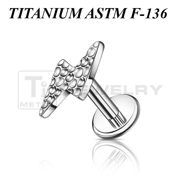 Лабрет из имплантационного титана 6Al-4V-Eli ASTM: F-136 в форме молнии с рельефными лунками. Размер декоративной части: 7,3х4мм.