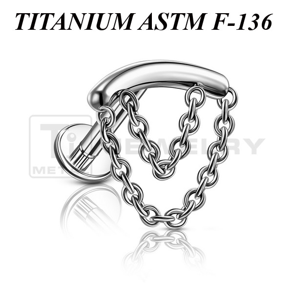 Лабрет из имплантационного титана 6Al-4V-Eli ASTM: F-136. Украшен накруткой в форме дуги с двойной цепочкой. Размер декоративной части: 10х10мм.