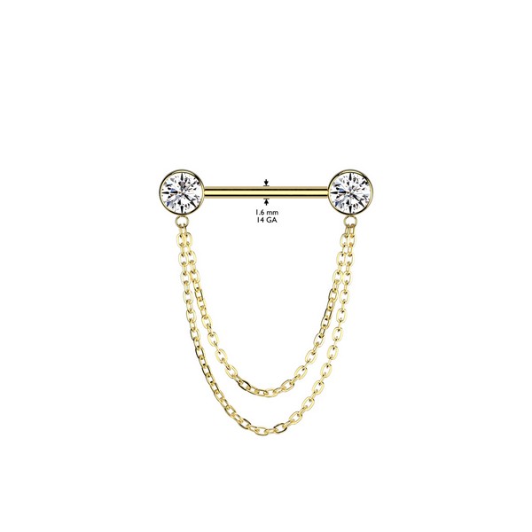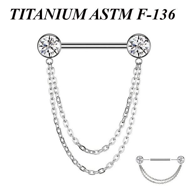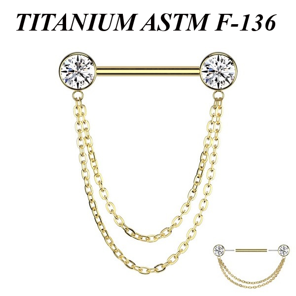 Безрезьбовое украшение для груди из имплантационного титана 6Al-4V-Eli ASTM: F-136 с прозрачными фианитами и двойной цепочкой. Представлено в двух вариантах: классическое титановое и с золотым PVD покрытием.