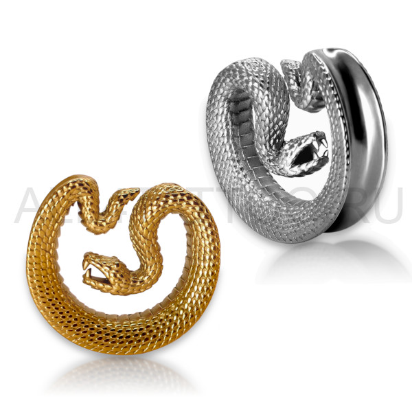 Тоннели из хирургической стали 316L в виде змеи. Представлены в двух вариантах: классические стальные и с золотым PVD покрытием.