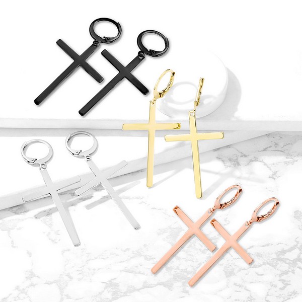 Серьги из хирургической стали 316L с подвеской в виде креста. Представлен так же вариант с золотым PVD покрытием. Размер подвески: 33х23мм.